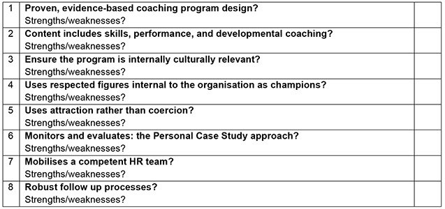 With increasing demands being placed on workers, organisational leaders must become more competent at engaging, inspiring and listening to their talent than ever before. A tool is needed to assist the HR decision maker to assess both if a coaching skills program has the required elements to realize a substantive shift in coaching competencies and to asses gaps in present organisational receptivity that can be redressed to assure the investment delivers on the expected changes in organisational culture.